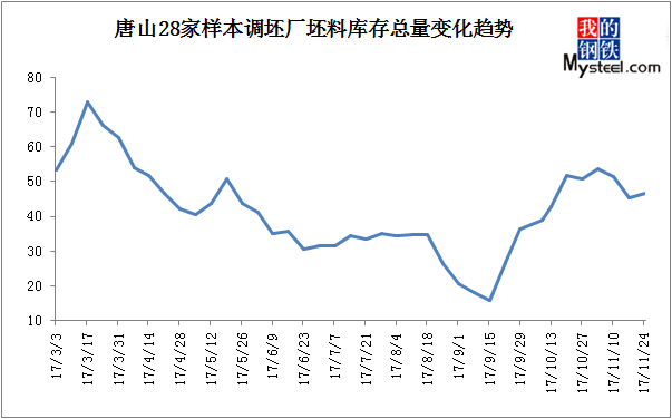 截止至11月26日,鋼城唐山采暖季高爐執行限產進入第二周。在上游供應端資源持續收緊以及需求方采購意愿偏低的現狀下,鋼坯主流價格由上周五的3780元/噸小幅攀升至3830元/噸,居高不下的價格在供需兩弱的市場中小幅走高。