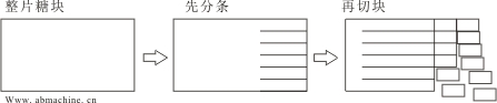 411切塊機,可用于切割牛軋糖,牛皮糖,米花糖等,前道工序壓成整個大糖塊,送到411牛皮糖切割機上,自動分切成條,同時切成塊狀,大小,厚薄都可適應,例如7厘米厚的米花糖塊可以切成1.2厘米*7厘米的小片,2.5厘米厚的牛軋糖塊,切成2.5*2.5厘米的小糖塊,同時也可根據客戶的要求做改動,和前道工序緊密連接,實現自動生產。