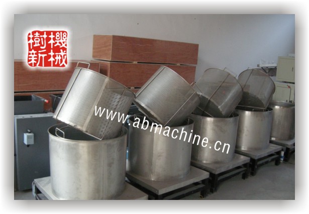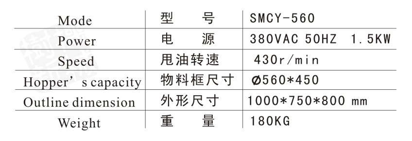 - 此甩油機與SMC-645成型機和SMCJ-35攪拌機配套使用,利用離心力,去除掉瓜或花生油炸好后的殘留油份.配套的兩個物料框可以直接用于油炸時使用. 配套成型機使用時,剛好半袋瓜子25斤炸一次,甩一次油,這樣循環(huán)操作